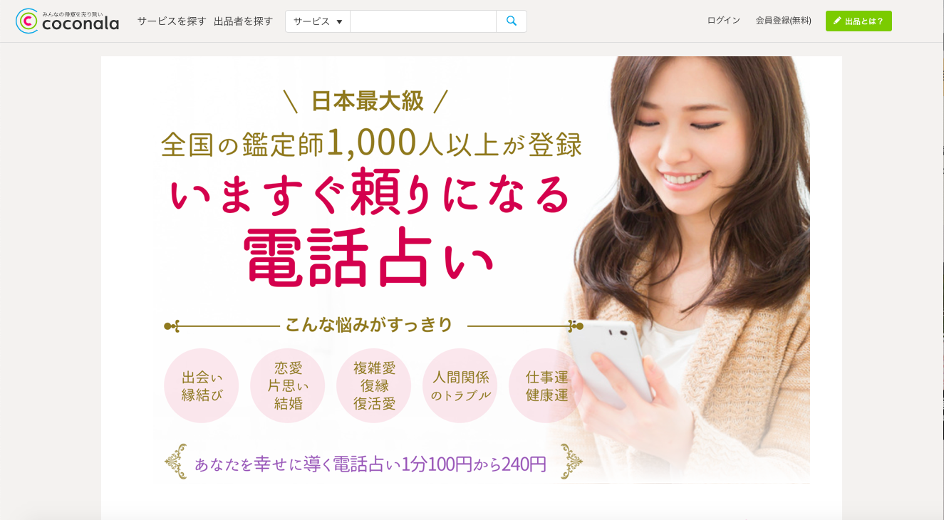全国の人気占い師が15,000人も在籍していて、100円〜と非常にリーズナブルなココナラ電話占い。