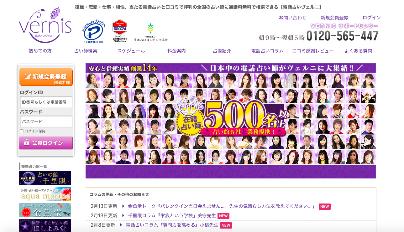 全国の人気占い師500人以上が在籍し、対面占い館とも提携のある電話占いヴェルニ。